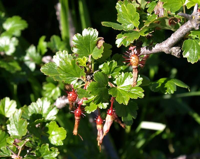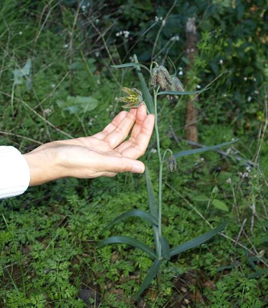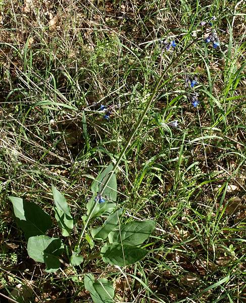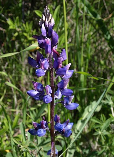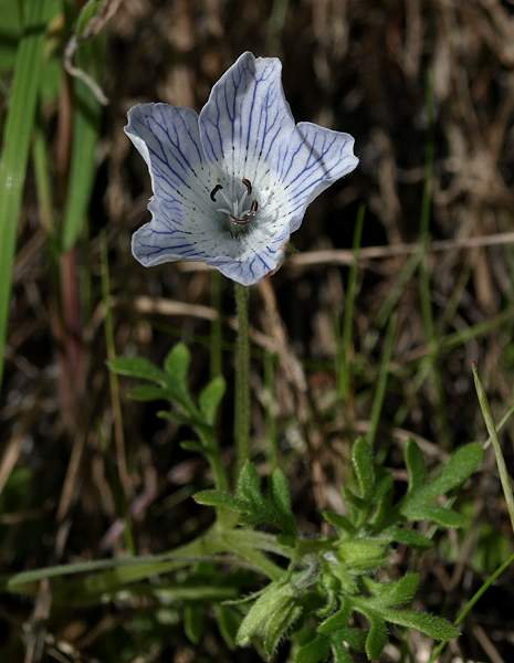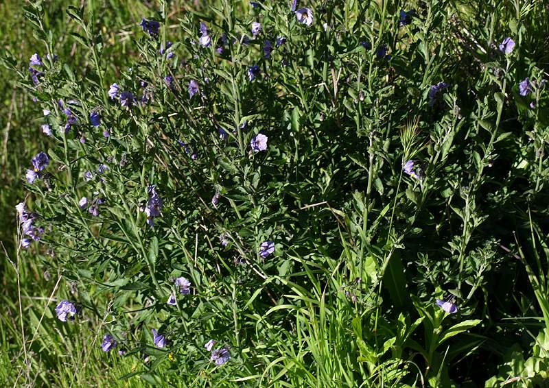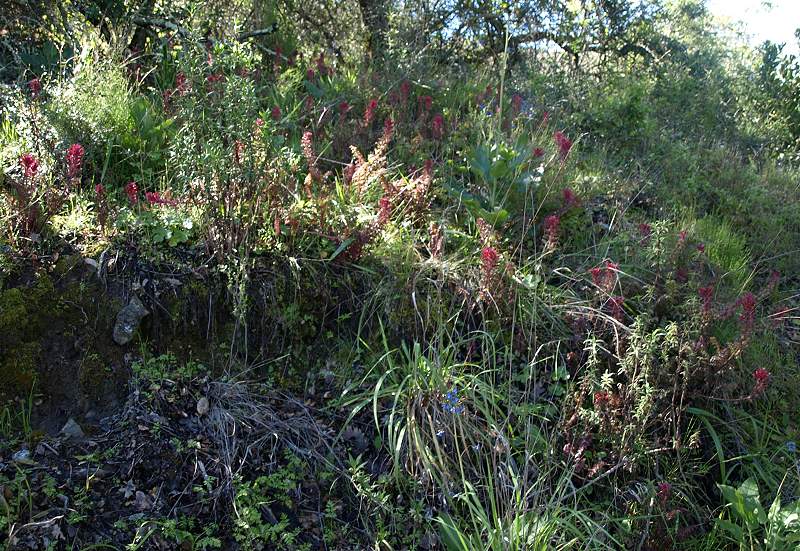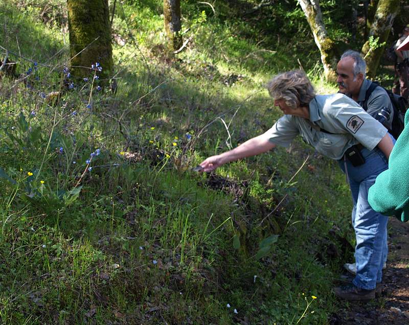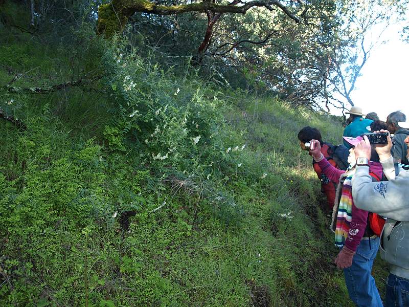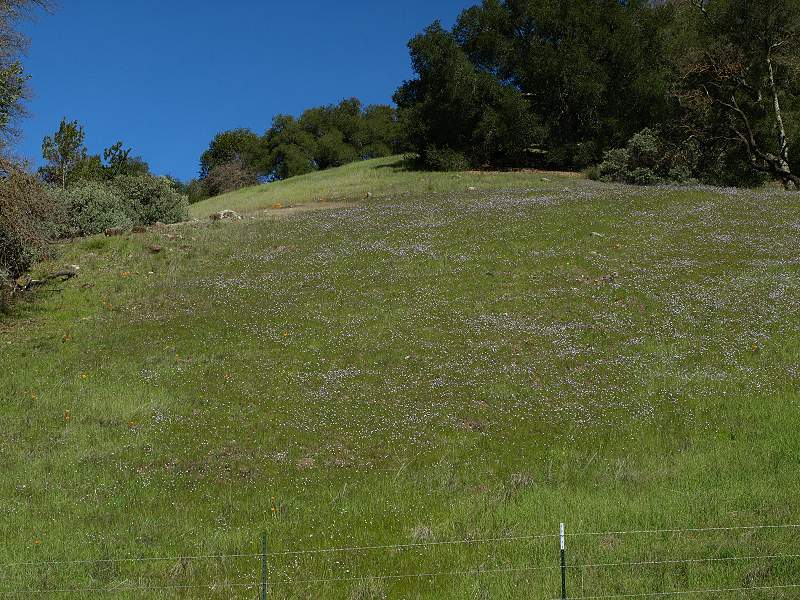 The group assembles at the Casa Loma Staging Area, at 700 feet in elevation. From the staging area, we take the Mayfair Ranch Trail, opened in 2007. In the field near the trailhead, Cait talks about the grafting of walnut trees. The Mayfair Ranch Trail, after it crosses Casa Loma Road, begins to ascend the hill. Johnny jump-ups Fiddlenecks line the side of the trail. Blue witch Hound's tongue Milkmaids Baby blue eyes Baby blue eyes, California buttercups, shooting stars As we crest the hill, we can see across the valley to the hills of Calero County Park. Across the valley, Calero County Park's Bald Peaks Trail leads along the ridgetop into Rancho Canada Del Oro. Looking at a rarely-seen fritillaria Fritillaria affinis, also called mission bells, chocolate lily, or checker lily Ferns line this shady stretch of trail. California buttercups Vetch Manzanita forest The trail emerges from the forest onto a ridge covered with scattered blue oak trees. Blue oaks View towards the Sierra Azuls. 3790-foot Mt. Loma Prieta is the peak on the right, the highest point in the Santa Cruz Mountains. View of the Blair Ranch, owned by the SCCOSA, but not yet open to the public except on special tours. Fremont star lily Looking at Indian warriors Indian warriors Heading up the hill along the ridge, through groves of blue oaks. Across the valley, we can see the Bald Peaks of Rancho Canada Del Oro. The highest point on that ridge is over 1800 feet. One last uphill stretch. Gooseberries This is near the high point of the trail, which is at about 1340 feet. We don't reach the highest point on the ridge, which is at 1767 feet. Rounding a bend, we can see 3486-foot Mt. Umunhum (left of center