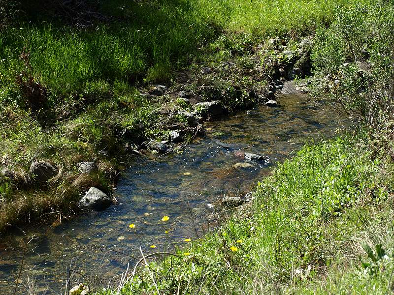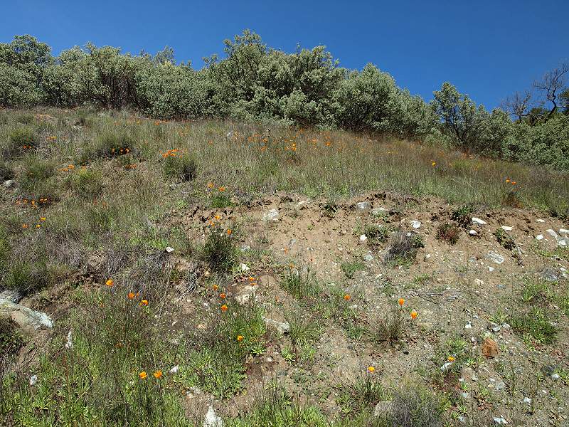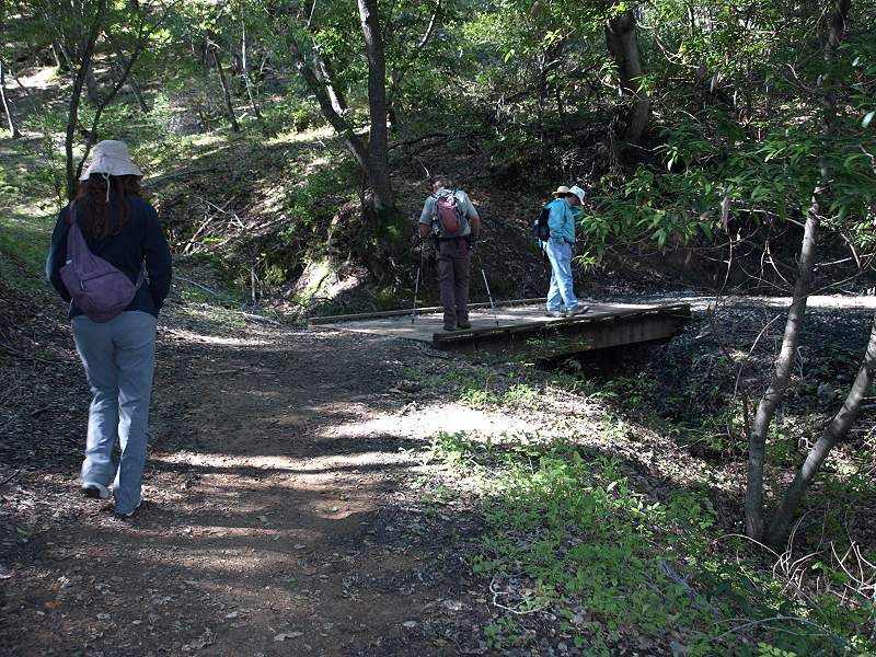 Descending the hill, we can see oak trees with bunches of parasitic mistletoe. Cait points out the wildflowers, which include hound's tongue and buttercups, on the hillside Bridge over a small creek. Group gathers at the rest stop at 1283 feet. Couple posing for a picture at the rest stop, which has a nice view across the valley. The trail begins to descend the hill rapidly on switchbacks. Heading down the hill, with the Bald Peaks looming above across the valley. Indian warriors Shooting stars and buttercups Crossing a small creek The trail reaches Baldy Ryan Creek and runs just above it. Trillium Moss-covered rocks by the side of the trail. Crossing the bridge over Baldy Ryan Creek. Past the creek, the Mayfair Ranch Trail ends where it intersects the Longwall Canyon Trail. Baldy Ryan Creek. Garter snake Arroyo lupine Bluedicks Going past a serpentine hillside Poppies grow below the manzanitas on the serpentine hillside Dudleya and lichens grow on the graywacke cliff by the trail. The tin building, used as a storage shed. Ahead, it reaches the junction with the Catamount Trail, which goes up the hill. The trail runs next to another serpentine-covered hill. The hill is covered with birdseye gilia and poppies. The trail runs next to an old cattle stile. It enters Calero County Park ahead. We return on the flat part of the Serpentine Loop Trail in Calero County Park. Note that all the trails in Calero are closed to bikes. The hill in Calero is covered with gilia. Baldy Ryan Creek At the Serpentine Loop trailhead, there are pink checkerblooms and yellow spring gold. Created