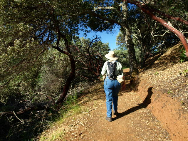 Mayfair Ranch trail climbs up the hill through oaks and manzanita.