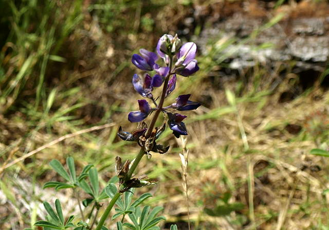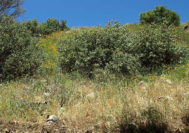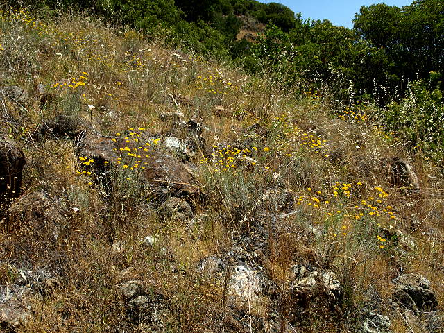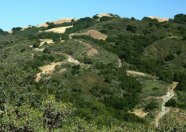 trail passes through an area of serpentine rock. Grasses are thinner.