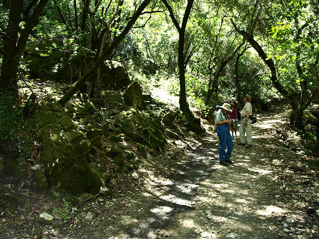 The trail begins a gradual descent through shady oak and laurel forests. In the forest, there is sufficient shade and moisture for several types of ferns to grow. Bridge over a creek in a deeply-shaded section. The