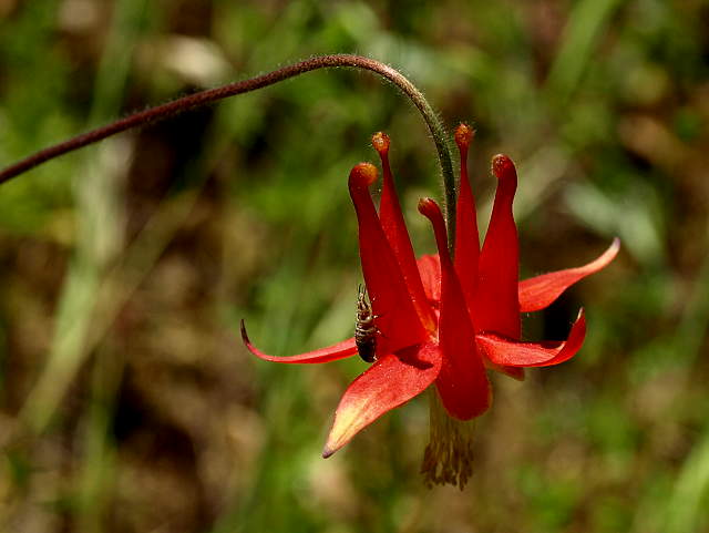 Sticky monkeyflowers and Indian paintbrush on a rock out-cropping near the rest area. Across the canyon, the Longwall Canyon Trail can be seen ascending the hill. Canyon dudleya growing on the rocks by the rest area. Leaves of a black oak tree. Seedheads. Lots of ithuriel's spears. The trails runs down the steep hill in a series of switchbacks. Fairy lanterns, or globe lilies. Larkspur. The