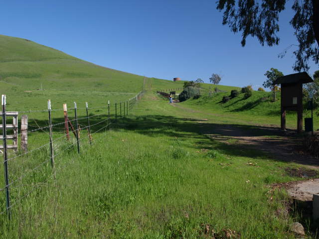 The service road leading up to the hang glider launching area. Water tank on the hill. Hang glider soaring over the park. View looking down at the hang glider access road crossing the Agua Caliente Trail. Looking up the Agua Caliente Trail, which climbs up the steep hill in a series of switchbacks. The Minnis Ranch Training Center, used by the County Parks, but not open to the public. Looking up towards the hang glider launch site. Hang glider soaring over Sandy Wool Lake. The Agua Caliente levels off and follows along the hillside. The trail nears a creek, marked by the line of trees. Hikers descend the trail beyond the creek. The creek area is very shady. It can be muddy. Cows grazing on the hillside keep the grass short. They may be right on the trail, so approach carefully. Hikers heading down the Agua Caliente Trail. At the trail junction of the Agua Caliente Trail and the Monument Peak Trail. Looking down at the junction of the Agua Caliente Trail (right) intersecting the lower part of the Monument Peak Road, which is a service road. Looking up at the start of the Monument Peak Trail. Cattle grazing above bikes on Monument Peak Road. Monument Peak Road crosses the Monument Peak Trail. The service road is used to bring hang gliders to the top of the ridge. Hikers are advised not to use the road. The Monument Peak Trail is hardly visible as it crosses through a cattle-grazed field. Cattle gate on the Monument Peak Trail. Turkeys on the hill. Looking back down the Monument Peak Trail. Shady ravine by the trail. The trail runs through a shady oak forest. The trail heading up the hill, running in and out of trees. Looking back down the hill, the Monument Peak Trail can barely be seen running through the field. Monument Road can be easily seen above it. The Monument Peak Trail heading up towards the Sierra Trail. Rocks on the hill below Monument Peak. The Sierra Trail leading south. It intersects Monument Peak Road. The Sierra Trail heading towards Monument Peak. As it was getting near sunset,
