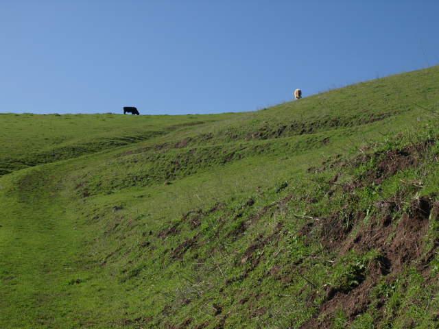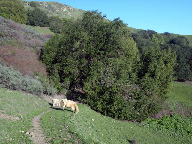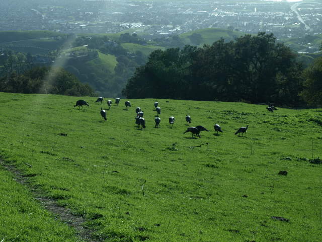 The pictures below are from the return trip. Cattle grazing on the Monument Peak Trail. Wild turkeys grazing by the trail. Looking down Monument Peak Road. Cattle grazing below the Agua Caliente Trail. Looking back along the Agua Caliente Trail before Monument Peak Road. Moon above the Agua Caliente Trail. Looking down at Sandy Wool Lake, with downtown San Jose in the distance. Mustard on the hill above the Agua Caliente Trail. Mustard, poppies, and the moon above the hills. Looking back up the Agua Caliente Trail (same view as above near the start of the hike). Looking down towards the end of the Agua Caliente Trail at the Tularcitos Trail junction. Page created by Ronald Horii,