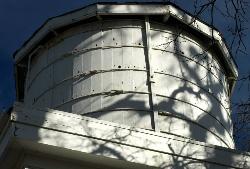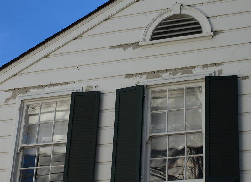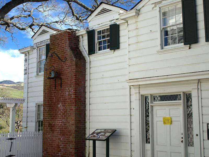 Lawn by the well near the ranch house Lawn near the horse camp Looking back towards the parking areas west of the ranch house Across from the horse camp Damage to the Grant Ranch House Earthquake damage to the chimney Woodpeckers have been pecking holes in the sides of the house. Woodpecker holes in the water tank. Page created by Ronald Horii,