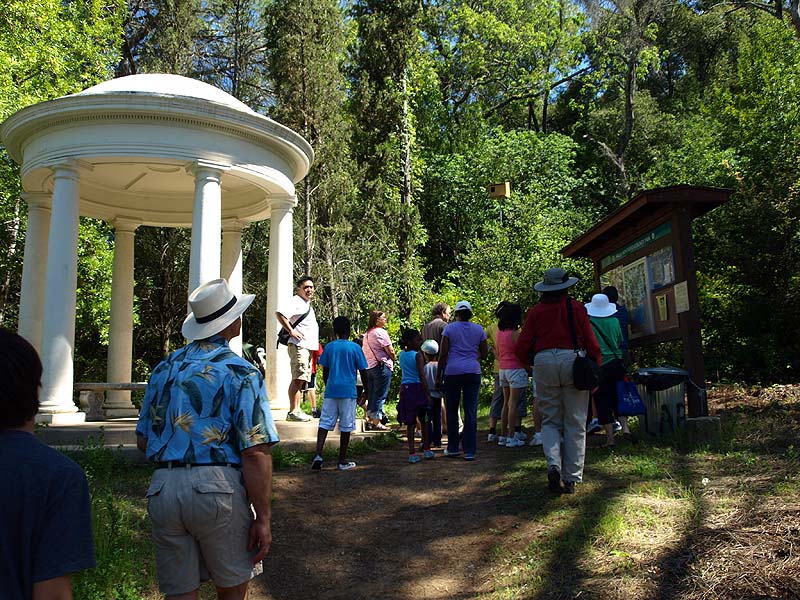Below are some pictures of most of this route, though not necessarily in the order listed in the guide. These pictures were taken on 4/21/12, during the Villa's centennial celebration. There was a ranger-led hike to Lookout Point, with a large group of hikers of all ages. The hike went up to Lookout Point. (Note that many of the art exhibits are changing, so they may not be there now.) This is the Lookout Trail entrance at the end of parking lot P3. The round temple-like pavilion is called the Belvedere. (4/21/12) ![]() The orange X's above show the route followed by this hike. It follows part of the Healthy Trails route to Lookout Point, but takes a shortcut up the Redwood Trail instead of taking the longer section of the Lookout Trail. The lower part of the Lookout Trail runs through a mixed forest of oak and bay laurel. Ahead is the junction with the Nature Trail. The group takes a right turn on the Nature Trail, but the Healthy Trails route continues straight on the Lookout Trail, which will be shown below. The Nature Trail joins the short