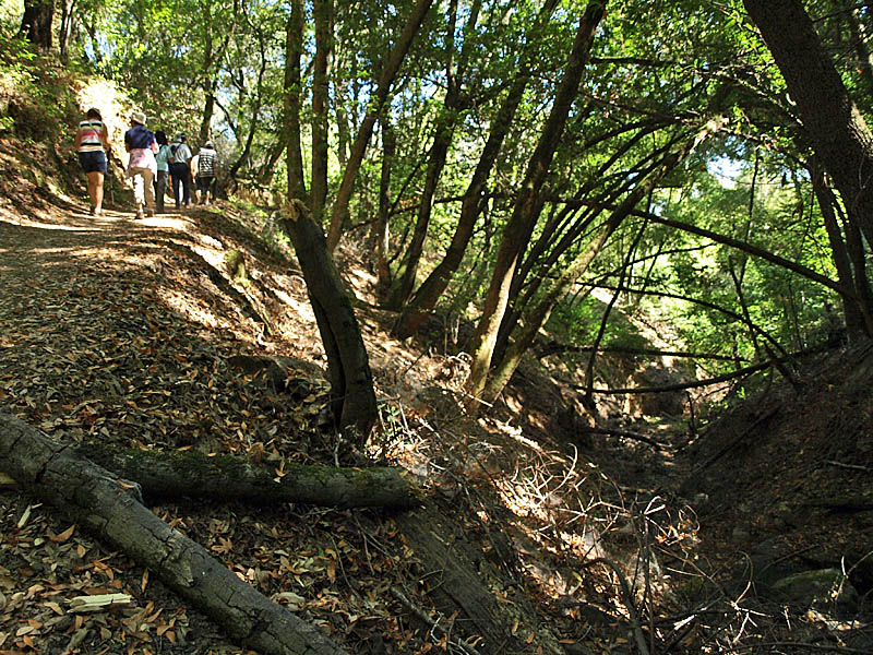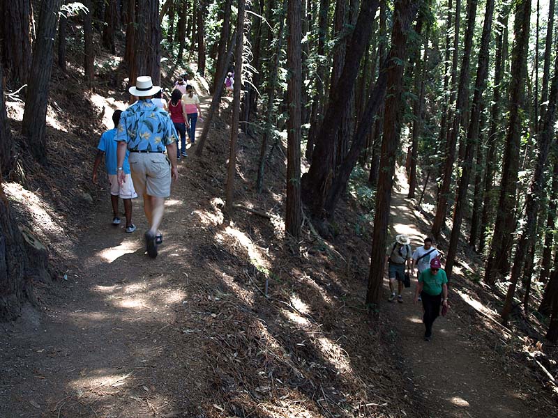 Carriage House Trail ends at the Redwood Trail. The group ascends the