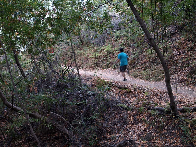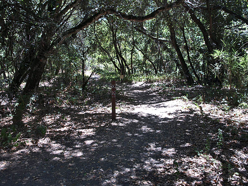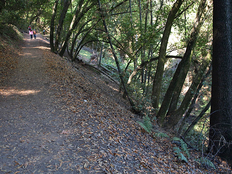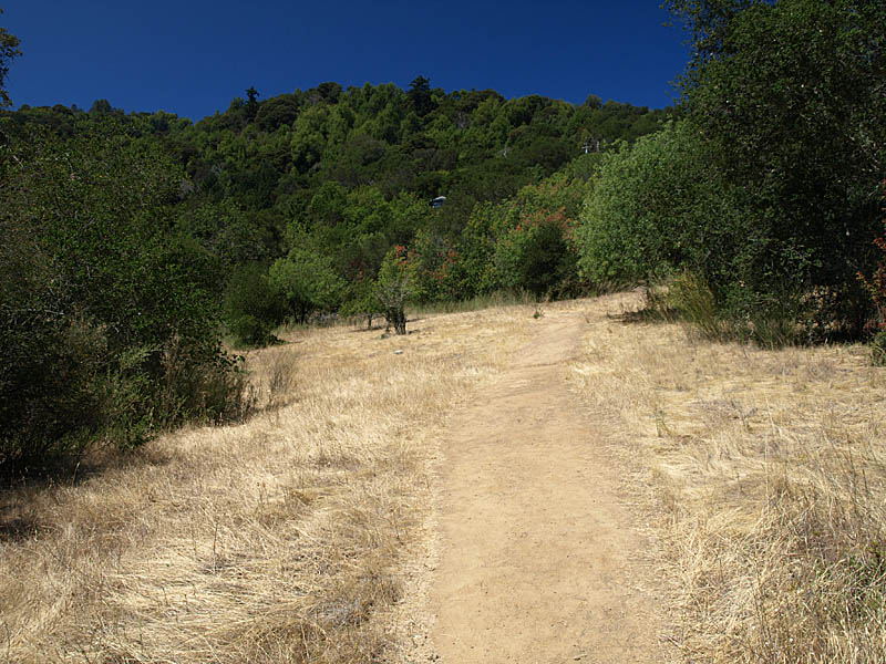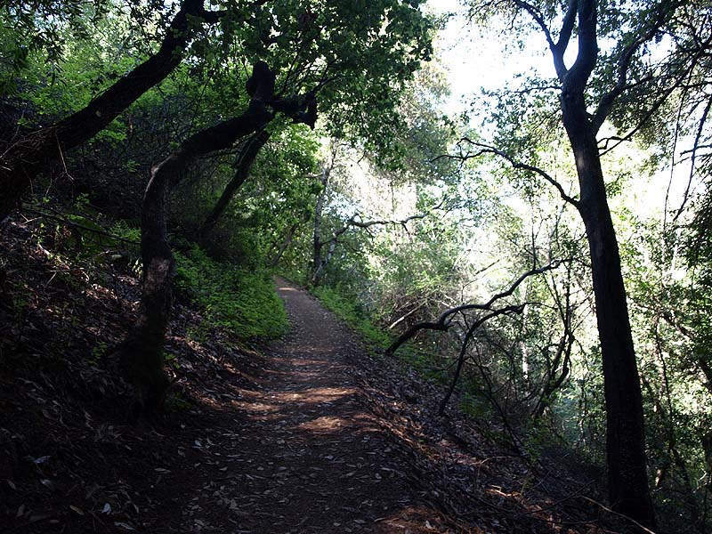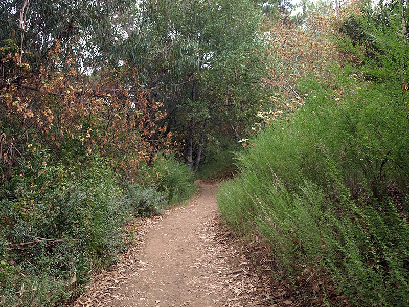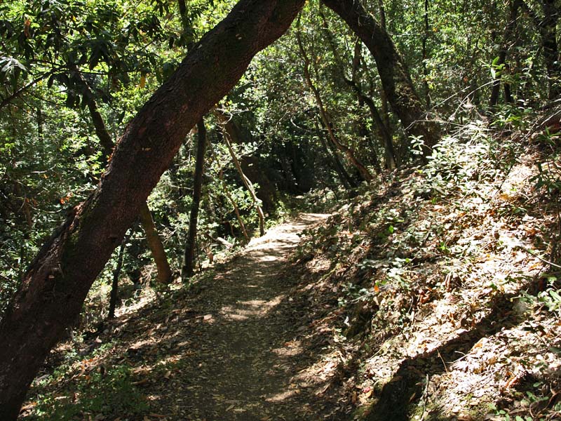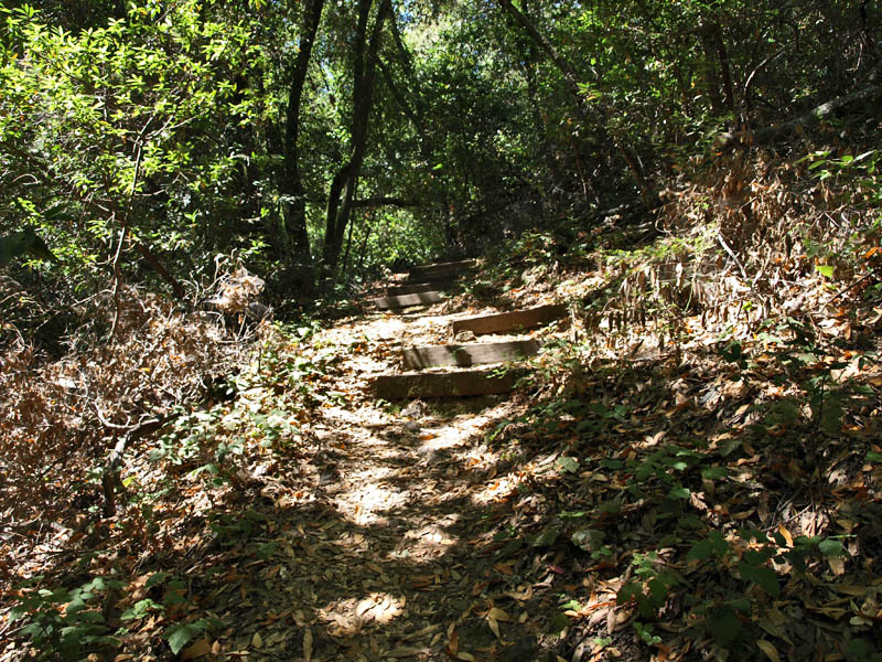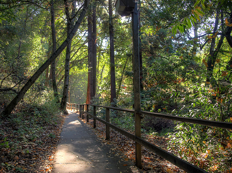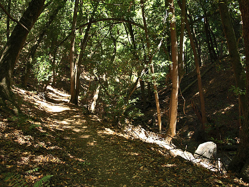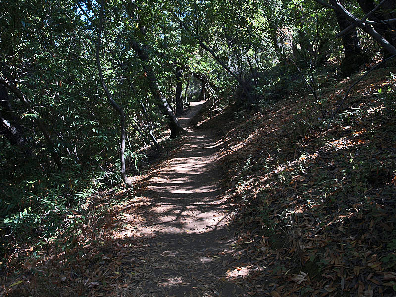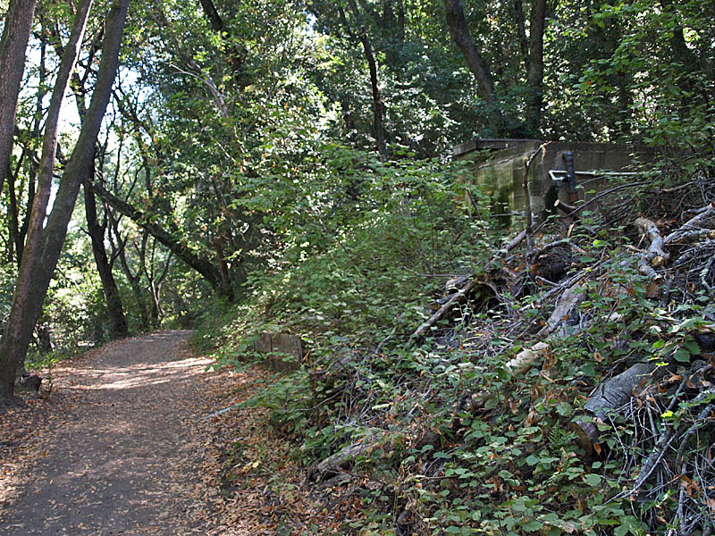 ![]() This trail route starts at the red X on the lower left and ends at the blue X on the upper right. It covers all the orchard trails and part of the Creek Trail. The North Orchard Trail begins at the switchback in the Lookout Trail seen above. It follows along the steep bank of Wildcat Creek. The North Orchard Trail crosses over Wildcat Creek, which is dry in the summer, then climbs up above the creek canyon on the north side. In 0.1 miles, the North Orchard Trail reaches the start of the South Orchard Trail (right). This will be taken later. Continuing on the North Orchard Trail, it passes through a young oak forest. After 0.1 miles, it reaches the Orchard Cut-off Trail, which is a shortcut to the South Orchard Trail. The North Orchard Trail crosses over a small creek on a bridge. The North Orchard Trail reaches this trail entrance on Norton. There is no parking on Norton Road immediately adjacent to this trail entrance. It is primarily used as a neighborhood entrance for the local residents. The North Orchard Trail crosses over another bridge over a small creek and enters a sunny, open area, the site of a former orchard. This is the view looking downhill from the top of the orchard area. This is a view downhill from the middle of the orchard area. This is a view looking back uphill from the middle of the orchard area. From the trail, you can see the rooftops of the Lucas Artists Residences, which are private. Access is restricted. The trail skirts around them. The trail enters a shady canyon again and crosses over a small creek on the bridge on the left. The North Orchard Trail reaches the junction with the South Orchard Trail, then in a short distance, goes downhill to meet the Creek Trail, shown above. Backtracking a little, this is the South Orchard Trail, which climbs up the south bank of Wildcat Creek. In some places, it has steps like these. This is the South Orchard Trail along the edge of the hillside above Wildcat Creek. The top of the South Orchard Trail runs mostly through partially shaded forest of madrones. I crosses the start of the Creek Trail. A short distance later, it crosses the Orchard Cut-off Trail, which leads to the North Orchard Trail. It continues for 0.1 miles to reach the North Orchard Trail. This is the start of the Creek Trail, which branches off of the South Orchard Trail. It descends the canyon to reach Wildcat Creek. This is the Creek Trail, which runs next to Wildcat Creek along its north bank. Looking across the creek, these are the switchbacks of the Redwood Trail seen below. The Creek Trail passes the junction with the North Orchard Trail, seen above, then crosses over Wildcat Creek on this bridge, where it meets the Redwood Trail seen below. The Creek Trail reaches the Access Trail (right). While it looks like the Creek Trail continues on the left, it actually ends after crossing the bridge over Wildcat Creek because it leads to the artists' residences, which are closed to the public. This is the Access Trail leading up to Parking Lot P2 next to the Villa. It passes by this old stone storage shed ahead. The Redwood Trail to the Creek Trail Shown below are HDR