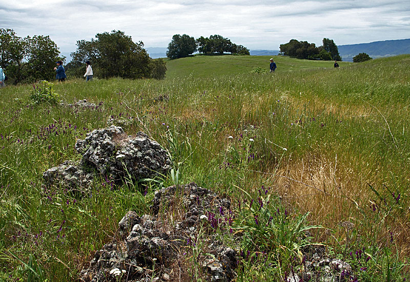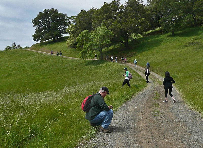 Equestrians pass by, providing more photo ops. At the Mummy Mountain Trail junction is a holder for a new interpretive sign and benches to take in the views of the South County. ![]() The class assembles at the start of the Mummy Mountain Trail. Ron talks about the points of interest. CH ![]() This is the junction of the Mendoza Trail and the Mummy Mountain Trail. One of the return routes will be along the Mendoza Trail. CH The class begins to head up the Mummy Mountain Trail. Mummy Mountain has the profile of a mummy. The trail begins along the "legs" of the mummy and ends at its "head." See the links to the left for more pictures of the Mummy Mountain Trail. ![]() The trail soon crosses over a wooden bridge. CH Crossing the bridge. ![]() Looking down the bridge. The converging lines of the bridge give a feeling of depth. CH ![]() The trail enters a shady forest, with wildflowers. Ron talked about taking pictures in the shade and low light, keeping the camera steady to prevent motion blur, and image stabilization. CH Shooting forest wildflowers. The trail passes by a huge sandstone cliff, pockmarked with tiny caves. ![]() The cliff provides many interesting photo ops. CH Looking up at the cliff, covered with lichens, moss, and dudleya. The trail runs by moss-covered boulders. ![]() The trail runs through a clearing, with hillsides covered in vetch. Ron points out the view. CH The trail runs through more trees, with glimpses of a large meadow with a picnic table. Miniature lupines in the meadow. Bluedicks in the meadow. After running around the meadow, the trail begins a gradual climb up to the summit of the ridge. Looking back at the class ascending the hill. An Indian paintbrush on the hill. The trail passes through another shady forest. Bright yellow sunflowers are on the hill above the trail. ![]() The trail reaches the ridgetop, with views to the west. CH View from the ridgetop looking towards Gilroy. ![]() The class heads up along the ridgetop. CH An oak tree provides a frame for a view of the class coming up the ridgetop. Sunflowers and vetch on the ridgetop. A fuchsia-flowered gooseberry bush. ![]() Heading along the eastern side of the ridgetop, with views to the east. CH The trail passes by a serpentine outcropping. As the soil changes from clay to serpentine, the vegetation changes from non-native grasses to native plants, adapted to serpentine. There are lots of rocks on top. Soon views of Coyote Lake open up. ![]() There is a picnic bench, overlooking Coyote Lake. CH View of Coyote Lake from the picnic table. ![]() Below are views of the Coyote Lake campground. There is a steep drop-off here. Ron warns not to get too close to the edge. CH There is another rest area with benches and an interpretive sign. At the high point of the trail, the view opens up to the west, looking towards Gilroy. There are gnarled oaks on the ridgetop. The trail descends a hand-cut stone stairway, a scenic spot for taking pictures of people. Looking back up the stairway. More views open up. This is looking towards Gilroy. This is a view looking north along the hills of the park, with Morgan Hill to the left and San Jose in the distance. Heading down the hill along the "chest" of the mummy. Descending this steep section of trail, in the distance is the marsh area of Coyote Lake. This is the view looking back towards the upper end of the lake, where Coyote Creek flows in as it comes out of the narrow canyon flanked by Palassou Preserve and Henry Coe State Park. A patch of sunflowers is above the trail. The trail emerges through trees to the mummy's "neck." These trees form a natural frame for the view. The trail crosses the mummy's "neck," with the small round hill forming its "head" in the background. The trail passes along the east side of the mummy's "head," with views of Coyote Lake on the right. This is a patch of a variety of flowers, including miniature lupine, tomcat clover, ithuriel's spears, and vetch. More wildflowers cover the hillsides in thick patches. These are Chinese houses. This hillside is covered with woodland peas and Chinese houses, with some mule's ear sunflowers on the upper right. The trail switches back below. In the distance is the Coyote Ridge Trail running up the hill and the new Gaviota Trail branching off to the left. The short Campground Trail in the center leads down from the Coyote Ridge Trail to the campground. This shady section of hillside is covered with ferns and miner's lettuce. The new Gaviota Trail, which opened the previous week, runs level along the hillside in the distance. It eventually connects to the Rancho San Ysidro Trail. It opens up a large section of the park on the west side of the ridge. Below it is an abandoned ranch road. The trail descends and switches back. The hillside here is covered with Chinese houses and yellow goldfields. Among the Chinese houses, there are also mule's ear sunflowers on the hill. ![]() Ron is taking pictures of the flowers. CH ![]() The group pauses at the end of the