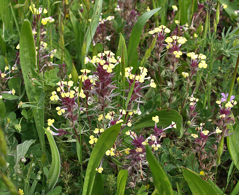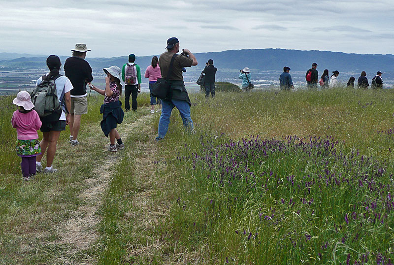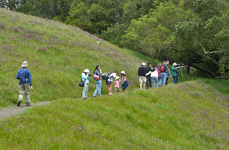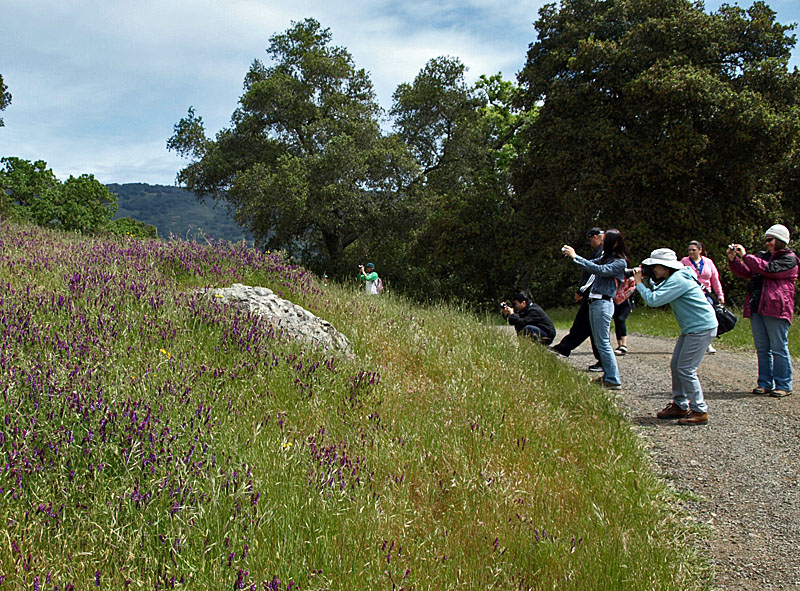 ![]() Ron describes the park and gets the group ready for the hike. He talks about the trails and trail safety. The hazards on this trail are ticks, poison oak, rattlesnakes, and steep cliffs. Wild pigs and mountain lions have been seen on the trails, even in mid-day. CH ![]() The group begins the hike on the Mendoza Trail. CH ![]() There are wildflowers on the hills around the trail, which invites taking pictures. CH Near the Coyote Ridge Trail junction (in the background), there is a bright patch of yellow butter-and-eggs. Closeup of butter-and-eggs. ![]() The class heads up the hill. The trail arching up the hill leads the eye into the scene, ending near one of the thirds of the frame (the "rule of thirds"). CH On the hillside is a thick patch of purple vetch, which makes a colorful foreground for taking pictures of the hill and rocks. As the trail ascends, more of the hills and ranches surrounding the park are revealed, providing more photo opportunities. Near the Mummy Mountain Trail