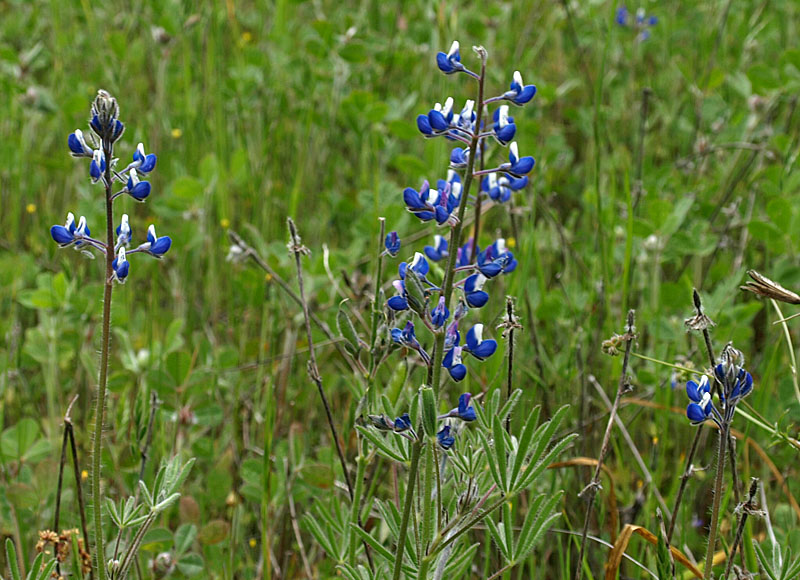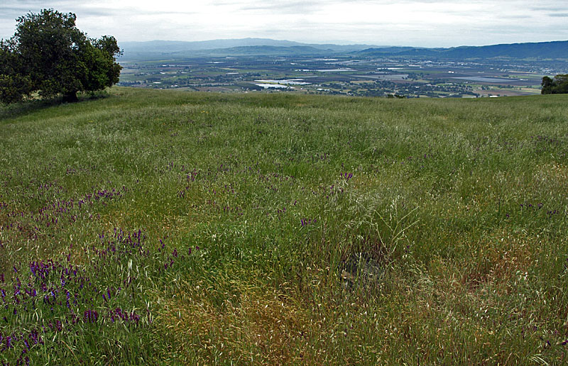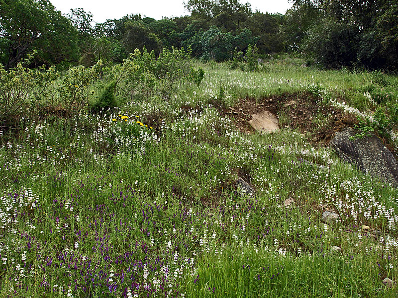 The Mendoza Trail runs below a hillside covered with wildflowers. Looking up the hillside, covered with Chinese houses, vetch, and sunflowers. Looking south across a line of fiddlenecks at the Gaviota Trail. There is a small farm pond below. View south of the hills of the park from the Mendoza Trail. The Mendoza Trail makes a long gradual climb, then descends to the Mummy Mountain Trail junction. Back at the Mendoza Ranch