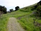looking up the Mine Trail from the trailhead. To the left, the fence