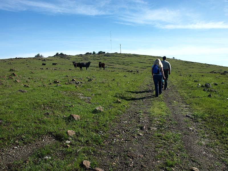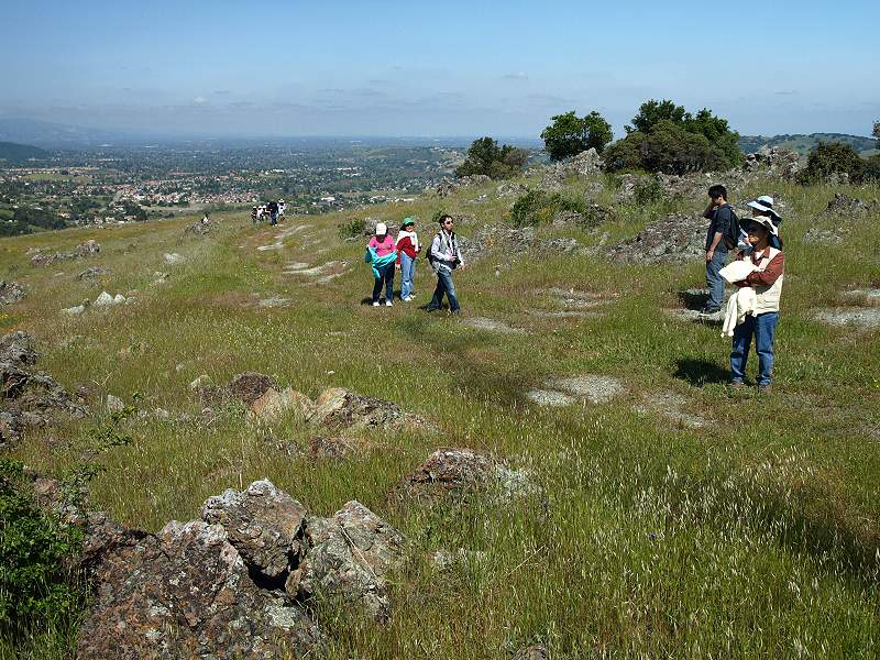 Carrie and Bill head up the trail where cattle are grazing along the route. The antenna-topped peak is ahead, but we follow the road around its flanks on the right. Bill and Carrie take the trail along the side of the hill. Cait takes pictures of the flowers. Santa Clara Valley dudleya and poppies grow on the rocks and serpentine soil on hill above the road. Carrie, Jan, and Cait look at some interesting insects. Carrie, Sam, and Jan hike up another hill where cattle are grazing. View of Calero Reservoir View of the nearby hills. The tall ridge in the background is in Calero and Rancho Canada Del Oro. Cait and Jan on the hill, with the Sierra Azuls in the background. Cait, Carrie, Sam, Jan, and Ron posing on the hill trail. In the background is the peak with the antenna. Note how the peak is a different color because of the serpentine soil. The near hills have clay soil and different flowers. Jan, Cait, Sam, Carrie, and Ron on the hill, with Calero Reservoir in the background. We're at about 918 feet. We head back from here. Yellow johnny jump-ups and pink checkerblooms are starting to pop up on the hills. The cattle have cropped the grasses, allowing the wildflowers to grow. This road leads down the valley to the edge of the property, near Cinnabar Hills Road. We head back through a stand of manzanitas. Map of Rancho San Vicente This