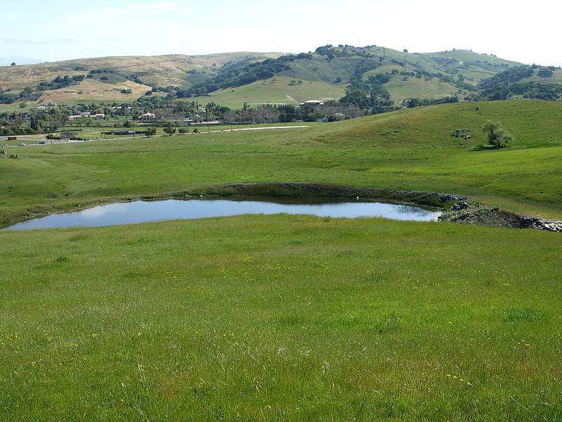 We met at the Calero Reservoir. Across from Calero, we could see our destination: the peak of Rancho San Vicente (right of center). We assembled at the Calero Reservoir parking lot, which has restrooms. We then caravaned over to Rancho San Vicente on McKean Road, led by ranger Fernando Elias. We parked at the corral and walk up the trail. Cait Hutnik (right) gave a talk on trail safety. Walking up the ranch road. The Stile Ranch Trail in Santa Teresa Park goes up the hill in the background on the right. Farm pond Above the Almaden-Calero Canal At a small pond fed by a spring at the base of the hill. Douglas' microseris, also called Douglas' silverpuffs Bee plants The endangered Santa Clara Valley
