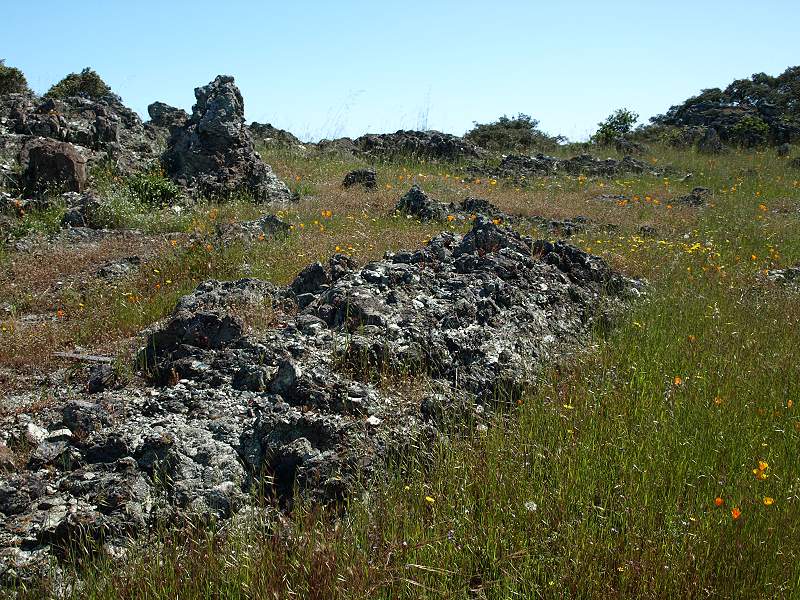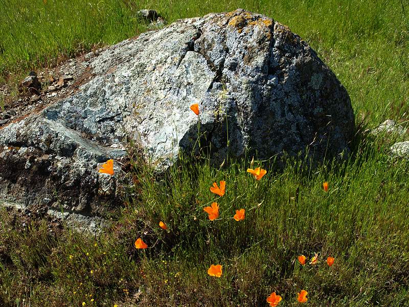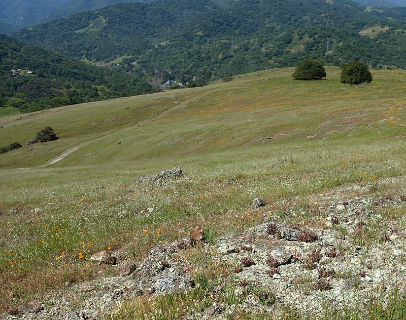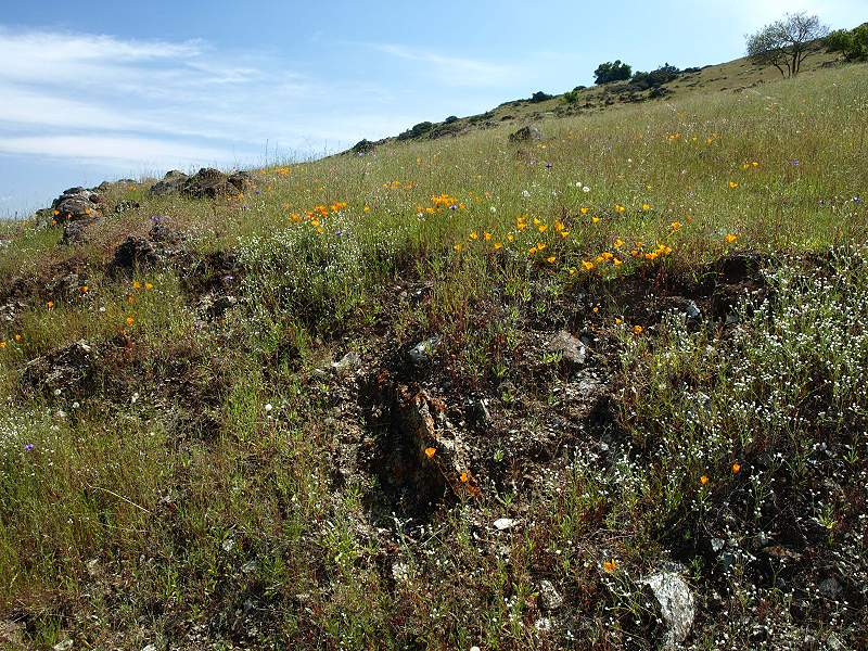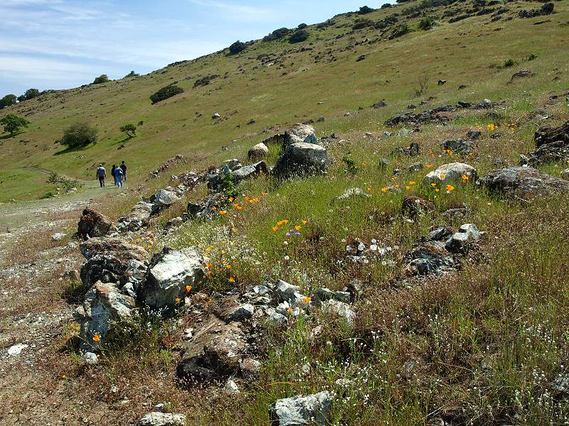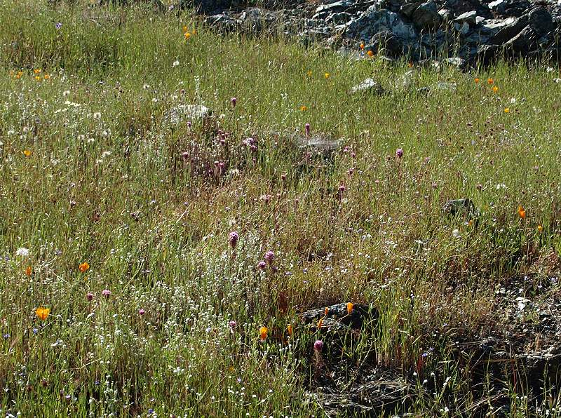 Hillside covered with poppies, silverpuffs, popcornflowers, and birdseye gilia Pink owl's clover among the popcornflowers and poppies Passing by a patch of seep-spring monkeyflowers Overlooking a patch of creamcups, poppies, and popcornflowers, with a view of the north part of Rancho San Vicente and the Almaden Valley The part of the trail has a gentle slope. Lichen-covered rocks, with the Almaden Valley in the background. Closeup of California gilia Goldfields in the foreground, Almaden Road in the background. Mike Boulland points out New Almaden and Almaden Quicksilver. View of the Casa Grande in New Almaden, with the hills of Almaden Quicksilver in the middle ground. The New Almaden Chimney can be see on the hill on the left. The Sierra Azuls topped by Mt. Umunhum are in the background. Patches of goldfields and dwarf plantain on the hillside. Poppies and plantain by a lichen-covered rock. Poppies, popcornflowers in the