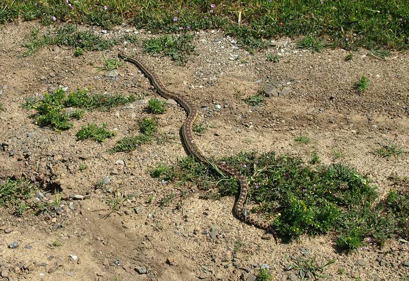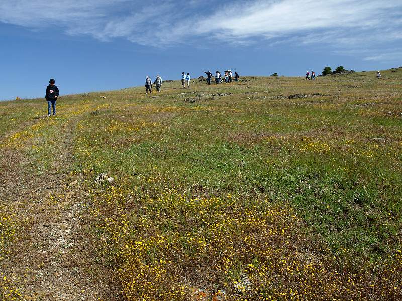 The trail turns and begins to ascend more steeply. Golden yarrow and bluedicks in the foreground, hills of Rancho San Vicente in the mid-ground, Santa Teresa Hills in the background. Photographing the yarrow. Tom Cochrane looking at a jeweled onion. The trail turns. In the background are the hills of Almaden Quicksilver County Park above New Almaden. Continuing around the bend. In the background is the South Almaden Valley. Goldfields cover the slopes near the peak. The grass has been cut short by cattle grazing. The trail reaches a junction. A service road goes up to the peak of the hill. Tom Cochrane looking at the serpentine morning glory (2 are in the foreground), surrounded by goldfields and birdseye gilia. Near the antenna-topped peak of the hill. Looking back from near the top of the peak towards the South Bay Area. Looking towards the Santa Teresa Hills from the peak. Making the final ascent to the peak. Rocks at the peak with dudleya, surrounded by a variety of wildflowers. At the peak, near the antenna. This is the highpoint of Rancho San Vicente, at about 1050 feet. Endangered Santa Clara dudleya on rocks on the peak. We step carefully to avoid them, following the path previously laid out by POST. Pink bitterroot flower growing in the rocks. View from the peak of Calero Reservoir and the hills immediately west of it. View from the peak of the Santa Teresa Hills southwest of Santa Teresa Park, which is the next set of hills behind them. Dudleya-covered rocks, McKean Road, and Calero Reservoir. Calero Dam and Calero Reservoir. The border of Rancho San Vicente is very close to the shore of Calero (see map below). Mike Boulland pointing out the points of interest. The service road in the center follows along the hills in Rancho San Vicente. In the background are the Bald Peaks of Calero County Park and Rancho Canada Del Oro Open Space Preserve. Dudleya in the foreground, New Almaden in the background, looking back at the trail we came up. Coming down from the peak. The slopes are covered with goldfields. Golden yarrow in the foreground. The sun has opened up the poppies lining the trail. Dudleya cover the rocks. Creamcups and poppies above the Almaden-Calero Canal. At the ranch gate. A gopher snake crosses the road. County Parks Staff and Docents Hike 2/28/10 On 2/28/10, docents Ron Horii,