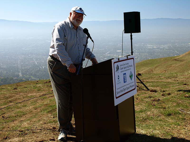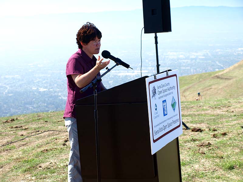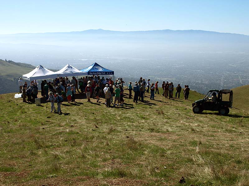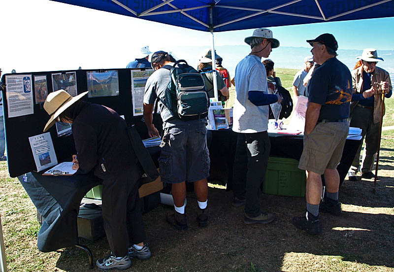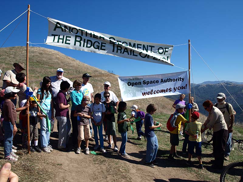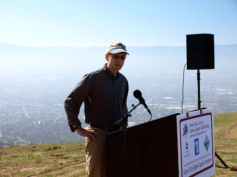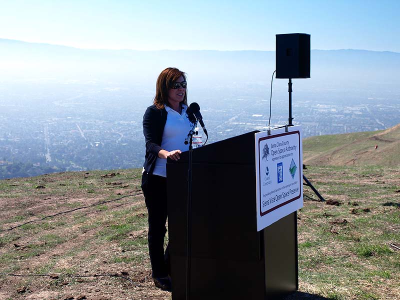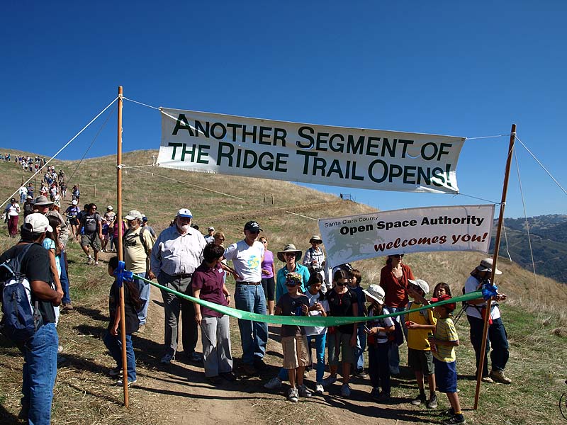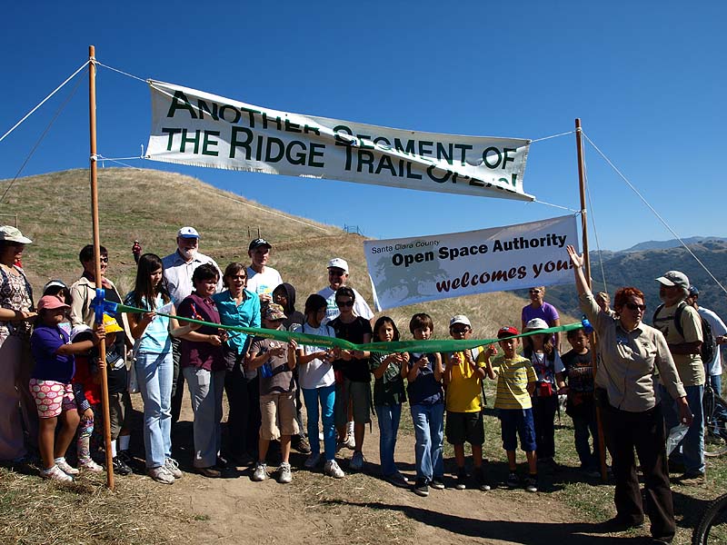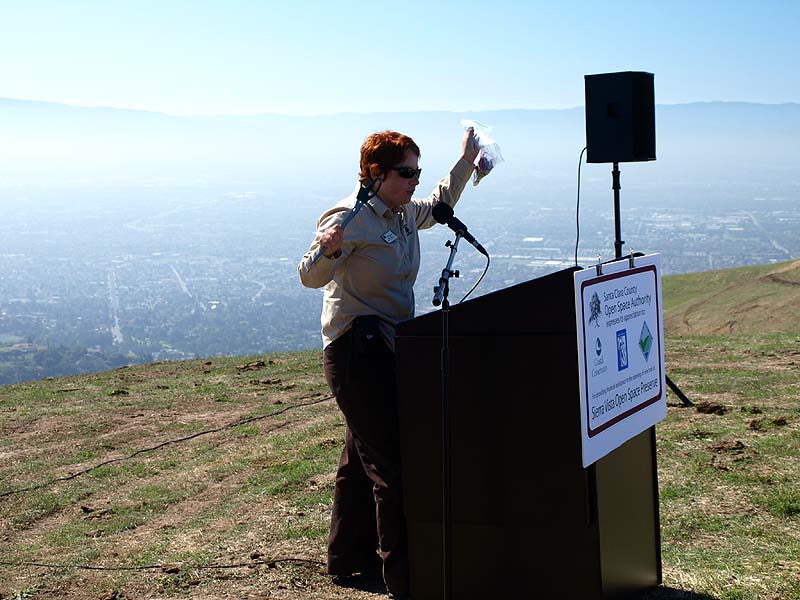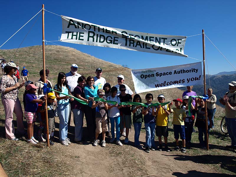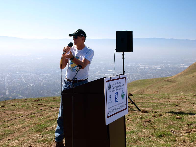 For this event only, the gate on Sierra Road was open, allowing a limited number of visitors to park near the start of the Sierra Vista trails. The gate is at about 2,000 feet, so it is higher than most of the trails. Alum Rock Park, the normal access point for the trails, starts at about 600 feet, so starting from Sierra Road provides a much easier access to the trails. In a few years, this may become a staging area. Setting up information booths. This is Sierra Road. The SCCOSA owns property on both sides of the road, but only the land on the right side of the road is open to the public so far. Chairs and a podium are being setup on the hill below where the opening ceremony speeches will be given. In the background is the city of San Jose. Another view of the speech area, with downtown San Jose in the background. As seen from a vantage point near Sierra Road, this is a view of the western intersection of the Calaveras Fault Trail going up the hill and the Sierra Vista Trail running level along the side of the hill. The Open Space Authority and Bay Area Ridge Trail Council have booths setup on the hill, with downtown San Jose in the background. Kitty Monahan (left) sets up animals pictures for kids to spot with binoculars, with help from Vince Oros (center), while Teri Rogoway, SCCOSA Coordinator of Interpretive Programs (right), looks on. Earlybird bikers test out the new Sierra Vista Trail. Bikers continue on the Sierra Vista Trail. Near the upper right of center on the bald-topped hills is where the trails end, at the Vista Point at the end of the Calaveras Fault Trail. Kitty Monahan (left) and Garnetta Annable (right). Kitty is on the SCCOSA's Citizen's Advisory Committee, representing trails. Garnetta is SCCOSA's District 4 Director. Visitors parked at Piedmont Hills High School and were bused up to the top of the hill. San Jose Parks & Recreation Commission Chairman Mike Flaugher (left) greets visitors. The Open Space Authority and Bay Area Ridge Trail booths were setup on the hill. Lake Cunningham Park is in the background. Visitors admire the view, with Alum Rock Falls Road crossing the hill in the background. View of the newly cut Sierra Vista Trail on the right, with the Boccardo Loop Trail ascending the hill on the left. An old rock wall crosses the Sierra Ridge Trail Guests visit the booths. At the SCCOSA's booth, docent Paul Billig points out Sierra Vista on the agency's property map. Steve Corelis provides activities for kids at the SCCOSA's booth. Displays at the SCCOSA's booth. At the Bay Area Ridge Trail's booth, Volunteer Coordinator Joel Gartland (center in the white hat) answers questions from visitors. Guests head down the hill to listen to listen to speeches. A large audience assembles to listen to the speeches. SCCOSA General Manager, Andrea MacKenzie Bay Area Ridge Trail Council Executive Director Janet McBride Matt Gerhart from the Coastal Conservancy, which helped fund Sierra Vista. Carl Guardino, CEO of the Silicon Valley Leadership Group, who biked up the hill. California Assemblymember Jim Beall, representing the 24th Assembly District, which includes San Jose. San Jose City Councilmember Nora Campos, who represents District 5 in East San Jose, which includes Alum Rock Park and Sierra Vista. Roberta Gonzalez, KPIX-TV meteorologist San Jose Mayor Chuck Reed Dana Litwin, SCCOSA Volunteer and Outreach Coordinator, planned the event. Here she invites the guests to come to the ribbon-cutting for the new trail. After the speeches, the group makes its way down to the trailhead. VIP's and kids gather at the ribbon-cutting ceremony near the trailhead. Dana Litwin gives the signal to cut the ribbon. Cutting the ribbon. The first bicyclists head up the trail. SCCOSA District 1 Director Alex Kennett on the right looks on. Bikes and hikers head up the start of the new Sierra Vista Trail. Hikers and bikers head up to the trailhead. In the background is the spur trail leading up to the viewpoint at the high point of the Boccardo Loop Trail. Down below from the start of the Sierra Vista Trail, the Boccardo Loop Trail can be seen climbing up the hill from Alum Rock Park. The trail crosses an old rock wall SCCOSA District 2 Director Jim Foran looks at the old rock wall by the trail. This portion of the trail is cut into a steep hillside above Alum Rock Park. This is a view looking back. The developed part of Alum Rock Park is at the bottom of the canyon. The South Rim Trail and Switchback Trail climb the hillside on the left. The Boccardo Hill Loop Trail is on the far right. Alum Rock Falls Road climbs the hill on the right. The road and hill are private property. Behind the hill is Upper Penitencia Creek, which originates on Poverty Ridge in the Diablo Range, flows into Cherry Flat Reservoir, and then into Alum Rock Park, where it is joined by Arroyo Aguague Creek. The trail makes a sharp bend. A small fence prevents trail users from going off the trail. The trail begins to descend the hill on switchbacks, entering a small grove of scattered oak trees. This view looking back shows the steep hillside above Alum Rock Park. The road below is Alum Rock Falls Road, which becomes a private road after it leaves the developed part of Alum Rock Park. Down below, the trail crosses over a bridge (behind the tree in the center). On the far right, the Sierra Vista Trail reaches a trail junction with the Calaveras Fault Trail, which climbs the hill on the right. Sierra Road runs just below the hilltops in the background. Looking to the right from the same viewpoint as above, the Calaveras Fault Trail climbs to the top of the hill, approaching Sierra Road, while the Sierra Vista Trail runs nearly level across the hill to the right. A group led by docent Paul Billig arrives at the switchbacks. The switchbacks are shaded by oak trees. Down below, the Sierra Vista Trail crosses over a bridge whose supports are made of fiberglass. View of the Sierra Vista Trail. As the Sierra Vista Trail round