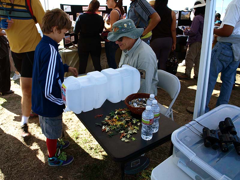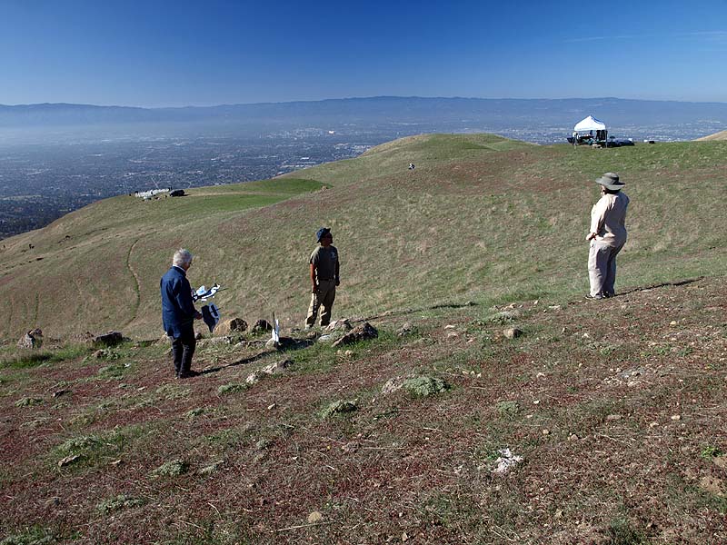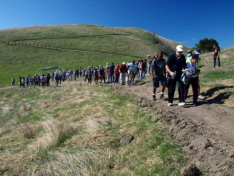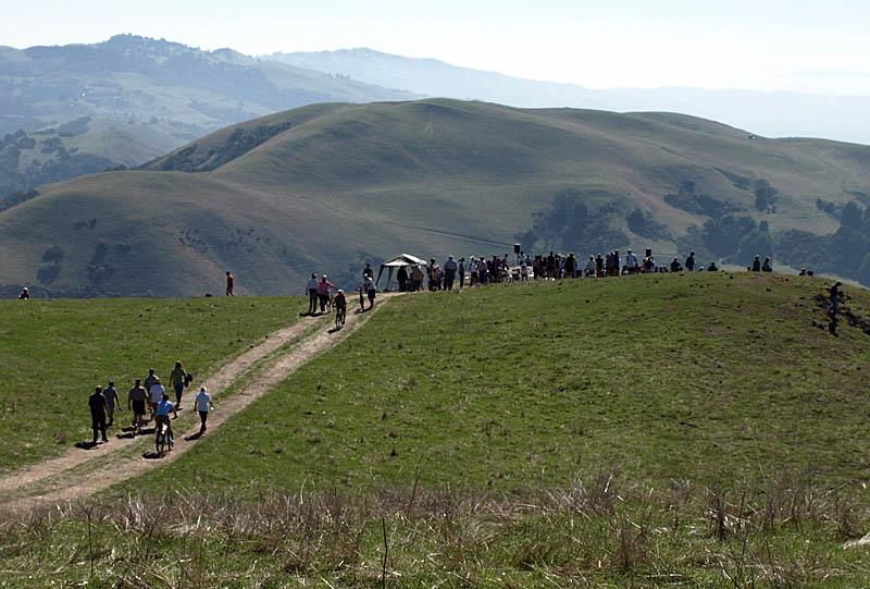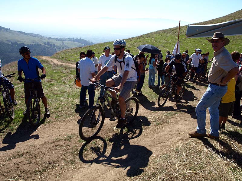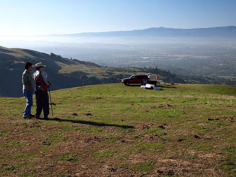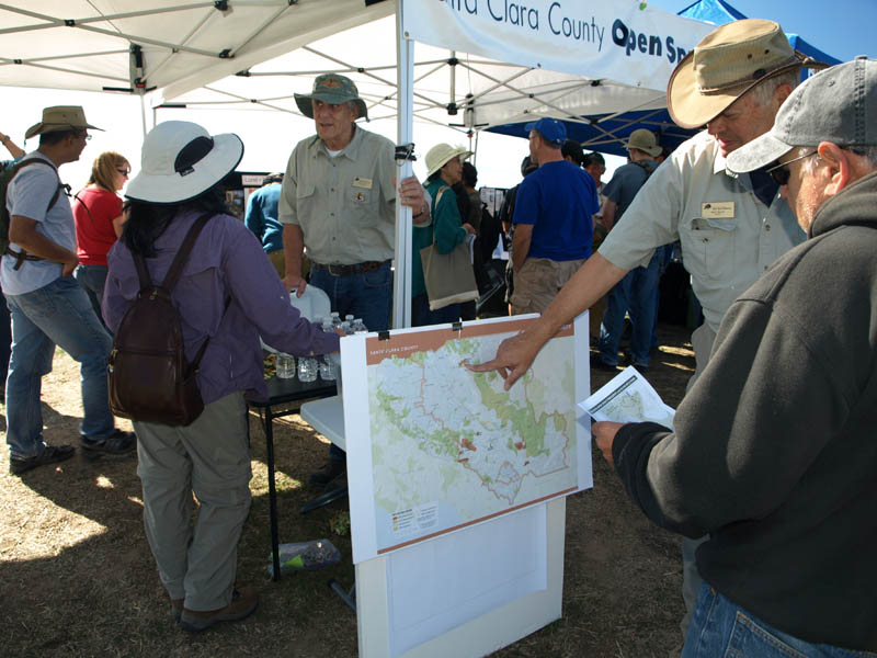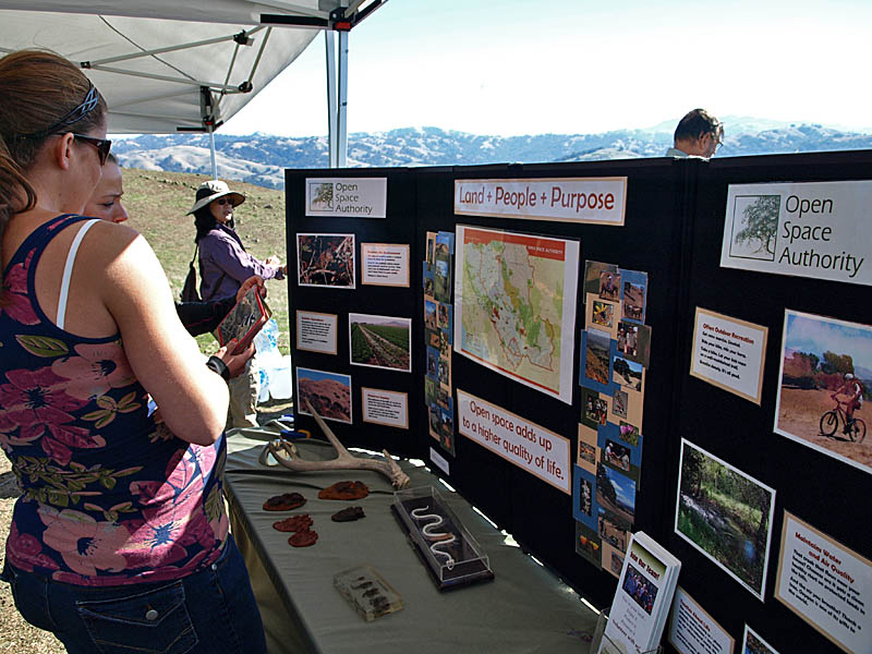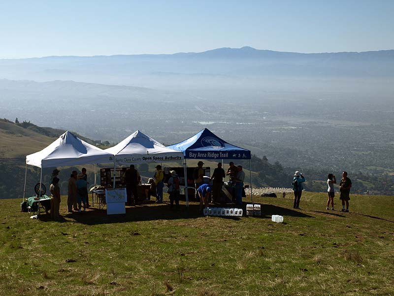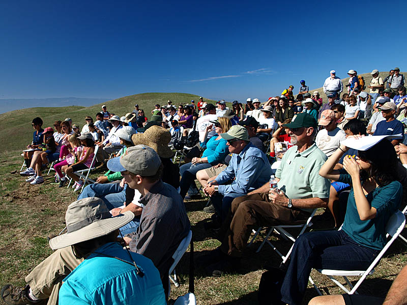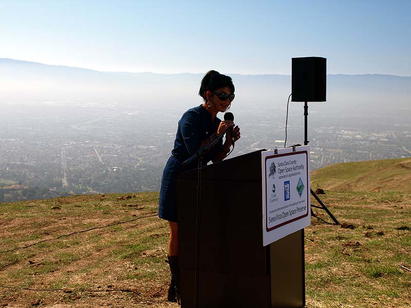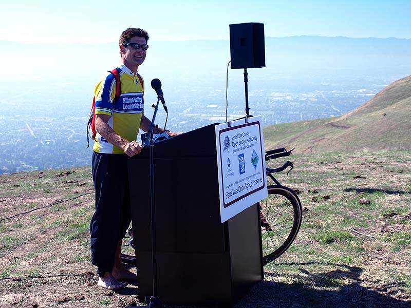 For this event only, the gate on Sierra Road was open, allowing a limited number of visitors to park near the start of the Sierra Vista trails. The gate is at about 2,000 feet, so it is higher than most of the trails. Alum Rock Park, the normal access point for the trails, starts at about 600 feet, so starting from Sierra Road provides a much easier access to the trails. In a few years, this may become a staging area. Setting up information booths. This is Sierra Road. The SCCOSA owns property on both sides of the road, but only the land on the right side of the road is open to the public so far. Chairs and a podium are being setup on the hill below where the opening ceremony speeches will be given. In the background is the city of San Jose. Another view of the speech area, with downtown San Jose in the background. As seen from a vantage point near Sierra Road, this is a view of the western intersection of the Calaveras Fault Trail going up the hill and the Sierra Vista Trail running level along the side of the hill. The Open Space Authority and Bay Area Ridge Trail Council have booths setup on the hill, with downtown San Jose in the background. Kitty Monahan (left) sets up animals pictures for kids to spot with binoculars, with help from Vince Oros (center), while Teri Rogoway, SCCOSA Coordinator of Interpretive Programs (right), looks on. Earlybird bikers test out the new Sierra Vista Trail. Bikers continue on the Sierra Vista Trail. Near the upper right of center on the bald-topped hills is where the trails end, at the Vista Point at the end of the Calaveras Fault Trail. Kitty Monahan (left) and Garnetta Annable (right). Kitty is on the SCCOSA's Citizen's Advisory Committee, representing trails. Garnetta is SCCOSA's District 4 Director. Visitors parked at Piedmont Hills High School and were bused up to the top of the hill. San Jose Parks & Recreation Commission Chairman Mike Flaugher (left) greets visitors. The Open Space Authority and Bay Area Ridge Trail booths were setup on the hill. Lake Cunningham Park is in the background. Visitors admire the view, with Alum Rock Falls Road crossing the hill in the background. View of the newly cut Sierra Vista Trail on the right, with the Boccardo Loop Trail ascending the hill on the left. An old rock wall crosses the Sierra Ridge Trail Guests visit the booths. At the SCCOSA's booth, docent Paul Billig points out Sierra Vista on the agency's property map. Steve Corelis provides activities for kids at the SCCOSA's booth. Displays at the SCCOSA's booth. At the Bay Area Ridge Trail's booth, Volunteer Coordinator Joel Gartland (center in the white hat) answers questions from visitors. Guests head down the hill to listen to listen to speeches. A large audience assembles to listen to the speeches. SCCOSA General Manager, Andrea MacKenzie Bay Area Ridge Trail Council Executive Director Janet McBride Matt Gerhart from the Coastal Conservancy, which helped fund Sierra Vista. Carl Guardino, CEO of the Silicon Valley Leadership Group, who biked up the hill. California Assemblymember Jim Beall, representing the 24th Assembly District, which includes San Jose. San Jose City Councilmember Nora Campos, who represents District 5 in East San Jose, which includes Alum Rock Park and Sierra Vista. Roberta Gonzalez, KPIX-TV meteorologist San Jose Mayor Chuck Reed Dana Litwin, SCCOSA Volunteer and Outreach Coordinator, planned the event. Here she invites the guests to come to the ribbon-cutting for the new trail. After the speeches, the group makes its way down to the trailhead. VIP's and kids gather at the ribbon-cutting ceremony near the trailhead. Dana Litwin gives the signal to cut the ribbon. Cutting the ribbon. The first bicyclists head up the trail. SCCOSA District 1 Director Alex Kennett on the right looks on. Bikes and hikers head up the start of the new Sierra Vista Trail. Hikers and bikers head up to the trailhead. In the background is the spur trail leading up to the viewpoint at the high point of the Boccardo Loop Trail. Down below from the start of the Sierra Vista Trail, the Boccardo Loop Trail can be seen climbing up the hill from Alum Rock Park. The trail crosses an old rock wall SCCOSA District 2 Director Jim Foran looks at the old rock wall by the trail. This portion of the trail is cut into a steep hillside above Alum Rock Park. This is a view looking back. The developed part of Alum Rock Park is at the bottom of the canyon. The South Rim Trail and Switchback Trail climb the hillside on the left. The Boccardo Hill Loop Trail is on the far right. Alum Rock Falls Road climbs the hill on the right. The road and hill are private property. Behind the hill is Upper Penitencia Creek, which originates on Poverty Ridge in the Diablo Range, flows into Cherry Flat Reservoir, and then into Alum Rock Park, where it is joined by Arroyo Aguague Creek. The trail makes a sharp bend. A small fence prevents trail users from going off the trail. The trail begins to descend the hill on switchbacks, entering a small grove of scattered oak trees. This view looking back shows the steep hillside above Alum Rock Park. The road below is Alum Rock Falls Road, which becomes a private road after it leaves the developed part of Alum Rock Park. Down below, the trail crosses over a bridge (behind the tree in the center). On the far right, the Sierra Vista Trail reaches a trail junction with the Calaveras Fault Trail, which climbs the hill on the right. Sierra Road runs just below the hilltops in the background. Looking to the right from the same viewpoint as above, the Calaveras Fault Trail climbs to the top of the hill, approaching Sierra Road, while the Sierra Vista Trail runs nearly level across the hill to the right. A group led by docent Paul Billig arrives at the switchbacks. The switchbacks are shaded by oak trees. Down below, the Sierra Vista Trail crosses over a bridge whose supports are made of fiberglass. View of the Sierra Vista Trail. As the Sierra Vista Trail round