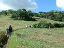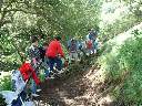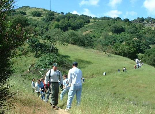 On California Trail Day, April 26, 2002, volunteers gathered at Santa Teresa County Park to help restore the Ohlone Trail at the far southeast corner of the park next to the archery range. In the morning, volunteers signed in at the archery range. Mike Boulland of the Friends of Santa Teresa Park brought in water and snacks. Park staff and volunteer trail leaders brought out the tools from the tool trailer and showed how to use them. After dividing up into groups, the trail leads led their groups along the trail. The Ohlone Trail begins near the entrance to the archery range, crosses over the Coyote-Alamitos Canal on a new footbridge, then winds along the hillsides above the golf course. It intersects a park service road, which was the limit for the trail work for the day. After a wet winter and spring, the trail had become overgrown, narrowing down to less than a foot in place. It was badly in need of clearing. Intermittent rains the prior weeks had softened the ground sufficiently so that it was easy to cut through the dirt and clear the sides of the trail. Luckily, it had not rained enough to make the the trail muddy. The day was sunny but cool, so conditions were ideal. Volunteers of all ages chopped down the weeds and widened the trail. An old trail footbridge was repaired by Boy Scouts. Almost the entire length of the trail segment was able to be cleared before lunch. Around noon, everyone headed back to the picnic area at the archery range. There was a ton of deli sandwiches provided, so everyone had plenty to eat. Trail Day patches were passed out to commemorate a productive and successful trail day. (Click on the thumbnails below to see a larger picture. Hit the "Back" button on your browser to return.)