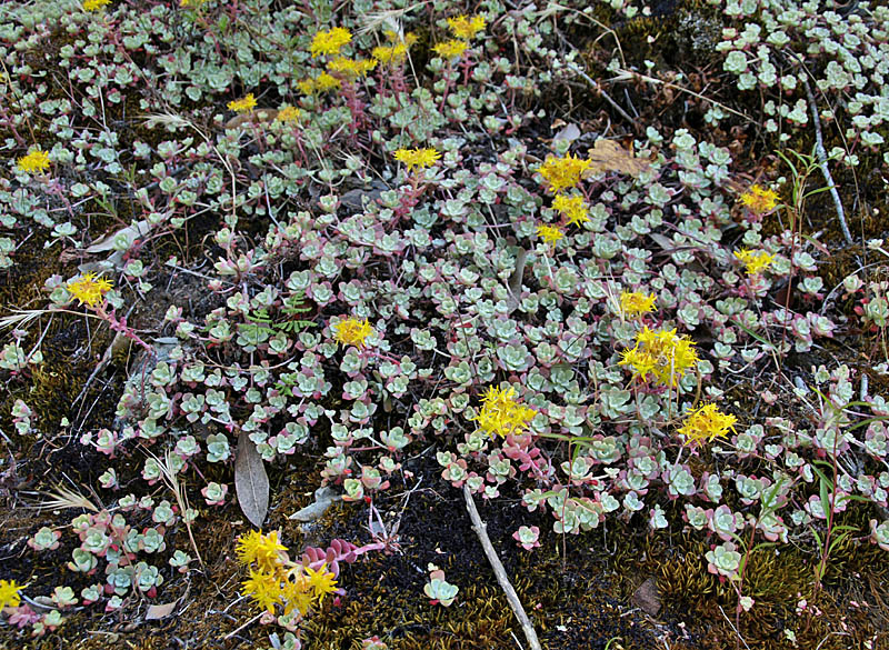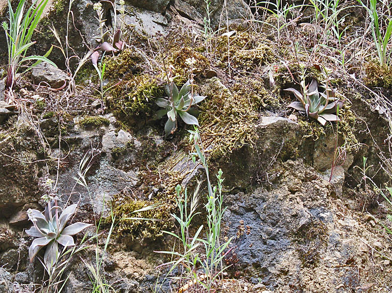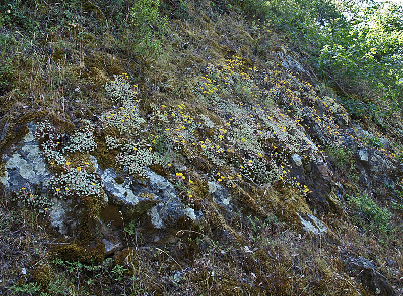 Four-spot clarkia near the parking lot. California poppies are common early in the spring, but these were the only poppies I saw on the trail. They were right behind the mapboard. View of the Sierra Azul range from near the trailhead. Johnny jump-up Ithuriel's spears are a common early spring wildflower. These were still hanging on near the trailhead. There were others on the west side of Guadalupe Creek. These are rose clover, a non-native introduced from Eurasia as a cover crop. Tomcat clover, unlike rose clover, is a native California plant. California wild roses View of the Los Capitancillos Ridge in Almaden Quicksilver County Park. The cut in the hillside on the right is above the Providencia Pond in Almaden Quicksilver. Downtown San Jose is on the left. Mission Peak is in the center. A banana slug crosses the trail. The Woods Trail is a wide, hard-surfaced trail that is populate with equestrians, bicyclists, and hikers. Fairy lanterns, also called globe lilies Fernald's iris Common or showy linanthus Zigzag or spreading larkspur Miner's lettuce Miner's lettuce Miner's lettuce comes in different shades of green, yellow, and red Crimson columbine and miner's lettuce More crimson columbines Fatleaf false solomon's seal Indian paintbrush Indian paintbrush Miniature lupine (right) Pacific or hillside pea Wood mint or hedge nettle Closeup of hedge nettle Seedhead of a silverpuff Closeup of broadleaf lupine flowers White-pink flowered broadleaf lupines growing next to a moss and fern-covered nook. Blue-purple flowers of broadleaf lupine Pink-flowered broadleaf lupine Redribbons, a type of clarkia Lots of redribbons Winecup clarkia Indian paintbrush on the hill, with Mt. Umunhum in the background. PG&E power lines arching over the canyon of Guadalupe Creek. The Woods Trail can be seen below the tower on the other side of the canyon. White blossoms bloom on the cones of a California buckeye tree, with Mt. Umunhum in the background. Variable checkerspot butterfly on a thistle Common yarrow Bluedicks Slender madia Hawksbeard Climbing morning glory View of Guadalupe Reservoir, with hedge nettle in the foreground Telephoto view of Guadalupe Reservoir, with Almaden Quicksilver County Park behind it, and downtown San Jose in the upper left. Mission Peak, Mt. Allison, and Monument peak above Fremont and Milpitas are at the top right. This is a further zoom-in view of Guadalupe Reservoir, with the Guadalupe and Mine Hill Trails behind it in Almaden Quicksilver, Hicks Road to the left of it, and Almaden Lake in the upper right corner. Zoom-in view of Mineta San Jose International Airport on the left to center, HP Pavilion and part of downtown San Jose on the right. A mixture of elk's clover and young bigleaf maples Woodland madia More woodland madia Lots of woodland madia White plectritis (white flowers) Tomcat clover View of the canyon of Guadalupe Creek, looking towards Almaden Quicksilver County Park on the right. ![]() At this point, before rounding the corner where the trail drops down to Guadalupe Creek, the whole rocky hillside is covered with Pacific stonecrop. (HDR picture) Pacific stonecrop, moss, and lichens grow on the nearly soilless rocky cliffside More Pacific stonecrop grow on the bare rocky section of the cliff, while other plants grow higher up where there is soil. Closeup of Pacific stonecrop Closeup of Pacific stonecrop and its yellow flowers. Golden yarrow Fernald's irises, Chinese houses. The base of the hillside is covered with Chinese houses. Closeup of Chinese houses Down below in the ravine behind this stand of Chinese houses is Guadalupe Creek Guadalupe Creek here is a mountain stream tumbling over boulders. The trail is very shady here, with ferns growing on the hillside. The trail crosses over Guadalupe Creek on a causeway. The creek flows under the trail through a big pipe. Guadalupe Creek eventually flows into Guadalupe Reservoir. On the other side of the creek, the trail climbs up the hillside. This is a view looking back across the canyon at the trail near the stonecrops The trail runs through a stand of eucalyptus trees. Indian paintbrush are growing on the hill. A group returns from a guided wildflower hike. The group included plant enthusiast Tom Cochrane, who helped me with the wildflower identification on this page. Phacelia, also called scorpionweed Looking back at the power lines crossing over the canyon. Looking back down the trail, the headwaters of Guadalupe Creek are up in the mountain slopes in the background, all part of Sierra Azul OSP. The trail climbs up to a flat, open area with views east revealing the Los Capitancillos Range and Almaden Quicksilver County Park. This open flat may have been used as a storage area. It is now covered with coyote brush. A brush rabbit is on the lower left. Yellow flowers of the invasive non-native broom plant California honeysuckle Western heart's-ease Fatleaf false soloman's seal Blue witch Big-berried manzanita Fremont's star lily Red thistle Columbines Canyon dudleya growing on a rocky cliffside Junction of the Woods Trail and Barlow Road (left) This is a view of the Woods Trail below Mt. Umunhum. The trail wraps around the hill below the mountaintop, then turns to the north to ascend Mt. El Sombroso. I turned around just beyond here and went back to go up Barlow Road. All the pictures below are from Barlow Road. Stipulate lotus Pacific starflower Dannie's skullcap Red leaves on a coast live oak Galls on manzanita leaves California buttercups California blackberry flowers Looking down steep Barlow Road, with the Woods Trail climbing Mt. El Sombroso in the background. A ceanothus bush is on the lower left. Closeup of ceanothus flowers. Yerba santa flowers Woodland-star Sticky monkeyflowers Looking down Barlow Road at about 2000 feet. Barlow Road is a steep trail that climbs up to Mt. Umunhum Road. Sticky monkeyflower bushes are on the right side of the trail. Looking up at the