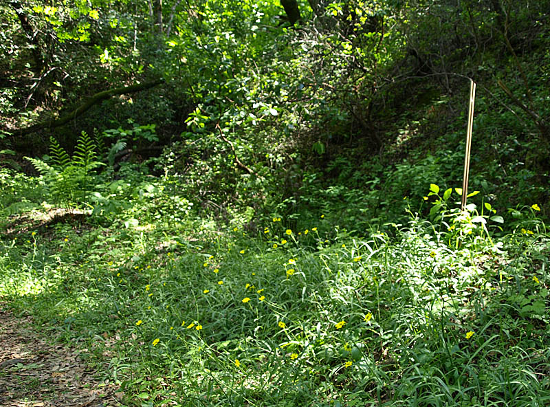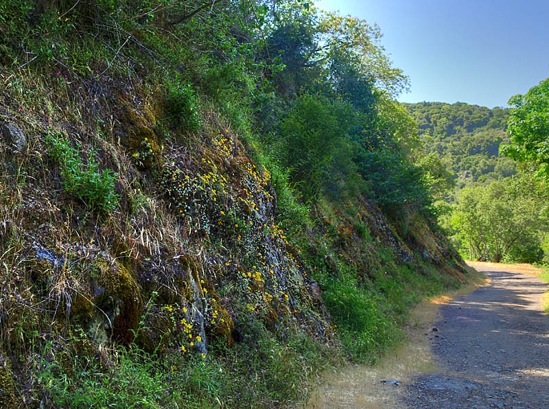 The Woods Trail is not known as a wildflower trail, but it is one of the best. It has a great variety of wildflowers that are close to the trail and are viewable without leaving the trail. The trail is easily accessible and runs mostly flat from Hicks Road to Guadalupe Creek. It follows along an old service road that was used to bring wood from the forests of the Sierra Azul range to the Almaden mercury mines. The road is cut into steep, rocky hillsides. Much of the route is shady. The soil, terrain, and disturbance provided by the road provide an environment that is friendly to wildflowers, but hostile to competing non-native grasses that would normally crowd out the wildflowers. I hiked the Woods Trail on 5/14/11 and 5/21/11. 5/14/11 was mostly overcast, with the sun coming out late in the afternoon. I followed the Woods Trail up to Barlow Road and went partway up Barlow Road. I used a Canon A720IS compact camera to take pictures on the way up and back. 5/21/11 was clear and sunny all day, but a bit hazy. I took pictures with an Olympus E-510 SLR. I followed the Woods Trail down to Guadalupe Creek. Most of the pictures below were taken on both days and are roughly in geographical order, but not in chronological order. Most of the pictures whose filenames begin with IMG were taken on 5/14 with the compact camera. Those that begin with P521 were taken on 5/21 with the SLR. While lighting conditions on those days were good for wildflowers, they were not too good for landscapes because of overcast and hazy skies and limited visibility. I came back on 5/29, which was a clearer day. I used both my compact and SLR cameras, along with a 40-150 mm zoom lens for my SLR. I walked up to the flat area past Guadalupe Creek in the late afternoon. Those pictures begin with P529 and IMG-1284. This is the Sierra